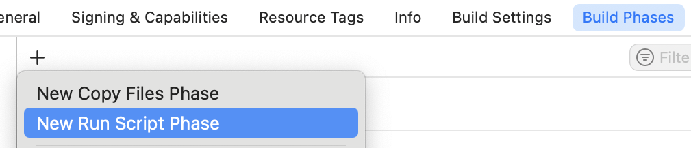 7. Click the + button and choose New Run Script Phase New Run Script Phase